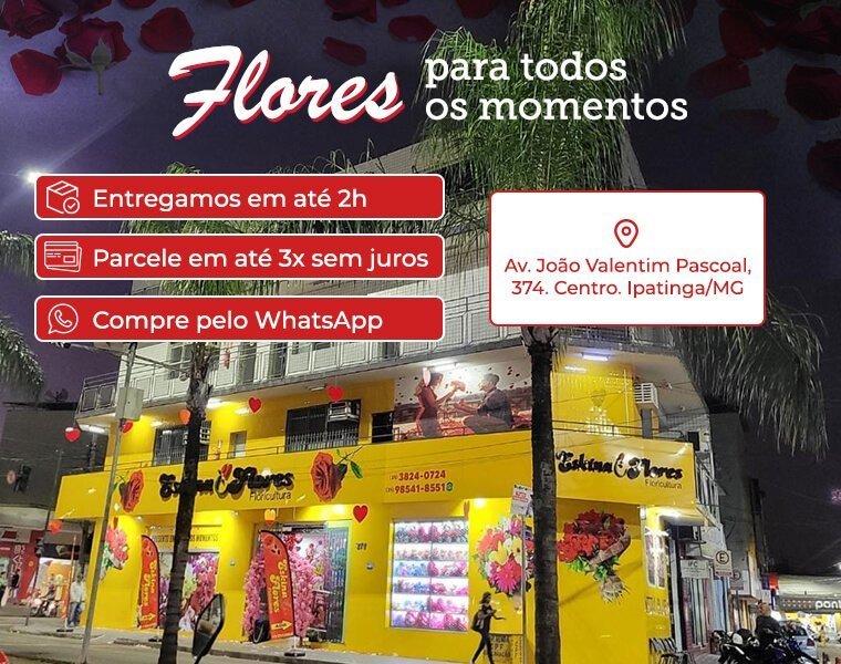EXCELENTE Com base em 118 avaliações Thalia Tamiris05/08/2025Trustindex verifica se a fonte original da avaliação é Google. Fui muito bem atendida e o buquê superou minhas expectativas! Flores frescas, entrega pontual e muito capricho no arranjo. Recomendo demais a floricultura! 🌷 Aelson Pereira21/06/2025Trustindex verifica se a fonte original da avaliação é Google. A melhor floricultura de Ipatinga ! A mais completa ! Excelente atendimento . Luiza Patricia19/06/2025Trustindex verifica se a fonte original da avaliação é Google. Kawan Basílio18/06/2025Trustindex verifica se a fonte original da avaliação é Google. Iranildes Dias18/06/2025Trustindex verifica se a fonte original da avaliação é Google. O atendimento é excelente. Os produtos de primeira. As atendentes são educadas, prestativas, a dona da loja extremamente atenciosa. Nota mil no geral. Gabriel Martins21/03/2025Trustindex verifica se a fonte original da avaliação é Google. Comprei algumas flores com eles. Ótimo atendimento, as meninas foram muito atenciosas e responderam todas as minhas dúvidas. Com certeza irei voltar e a gatinha adorou. Nelma Silva15/03/2025Trustindex verifica se a fonte original da avaliação é Google. Muito bom. Gustavo Matos12/03/2025Trustindex verifica se a fonte original da avaliação é Google. Francis08/03/2025Trustindex verifica se a fonte original da avaliação é Google. Johniston Fernandes13/11/2024Trustindex verifica se a fonte original da avaliação é Google. Variedade de produtos